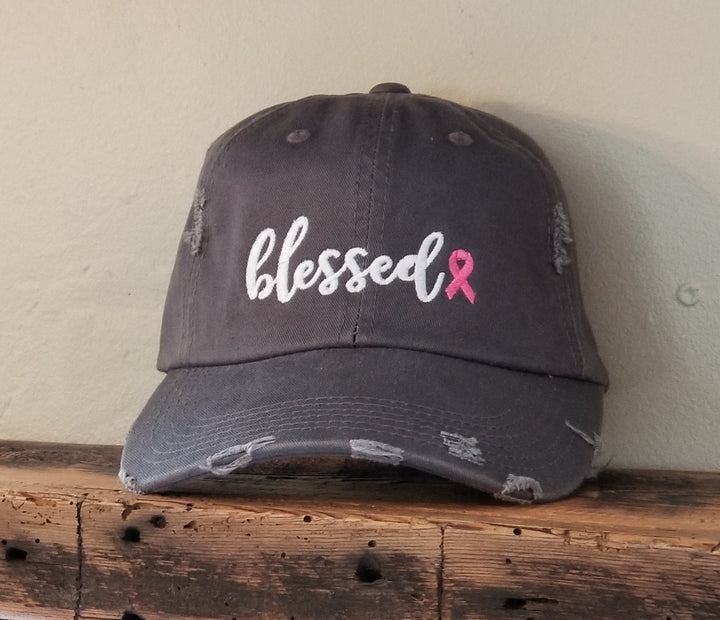 Blessed Breast Cancer Ribbon Distressed hat Nickel hat with pink ribbon