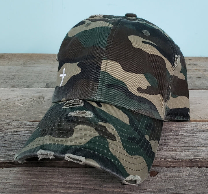Cross Camo baseball hat, Christian, distressed, vintage dad hat
