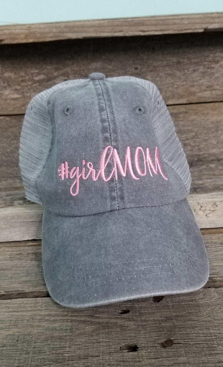 Girl Mom Trucker Hat, Pink and Gray, Mom of girls, embroidered