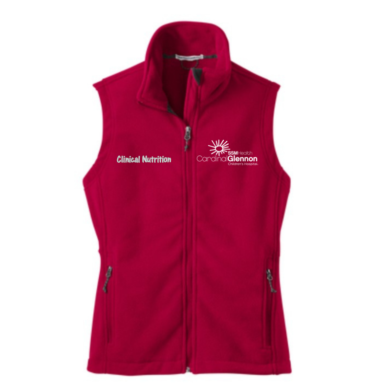 Fleece Vest w/embroidered Cardinal Glennon logo and "Clinical Nutrition" embroidered on right chest. Choose red or black