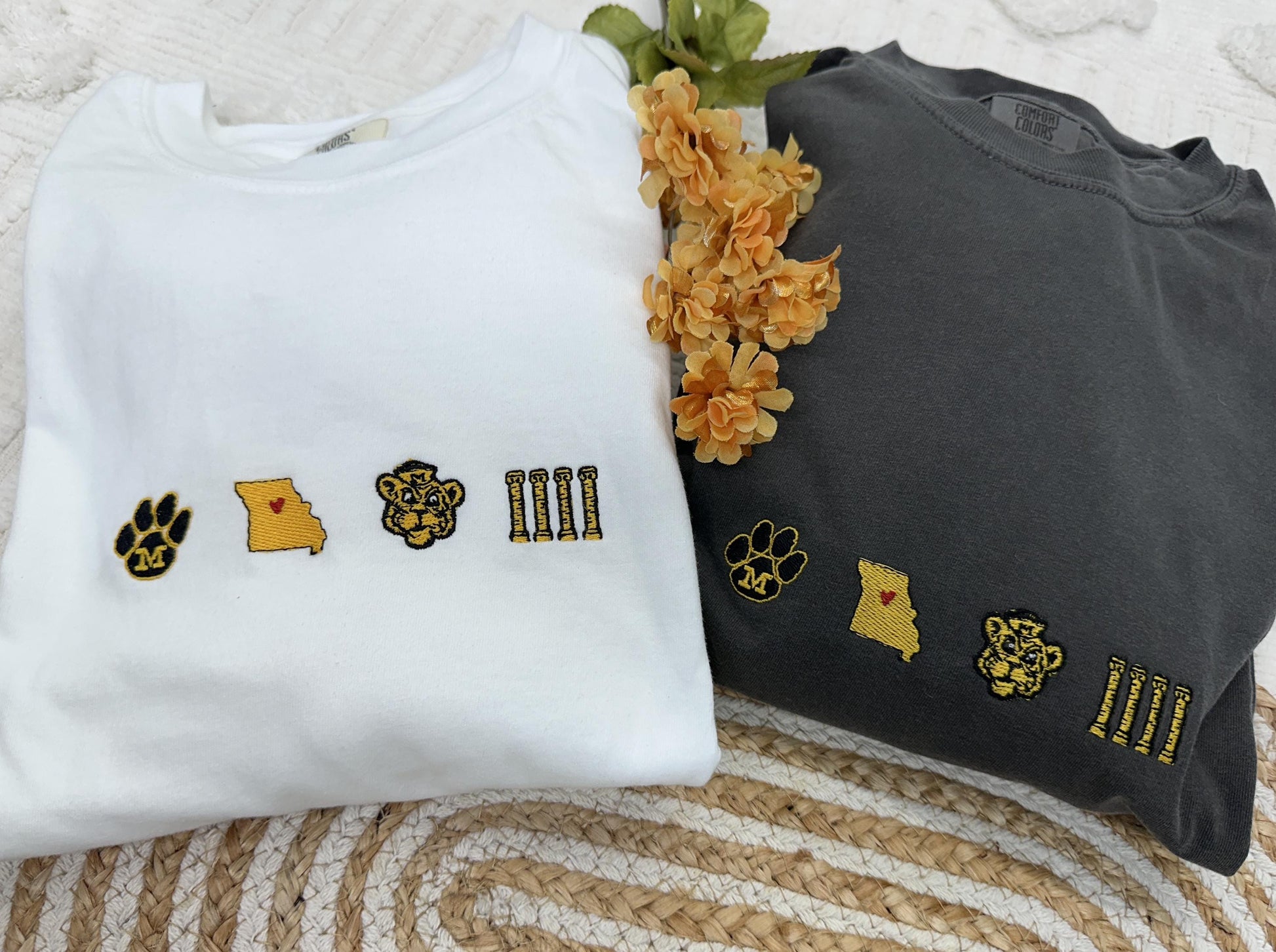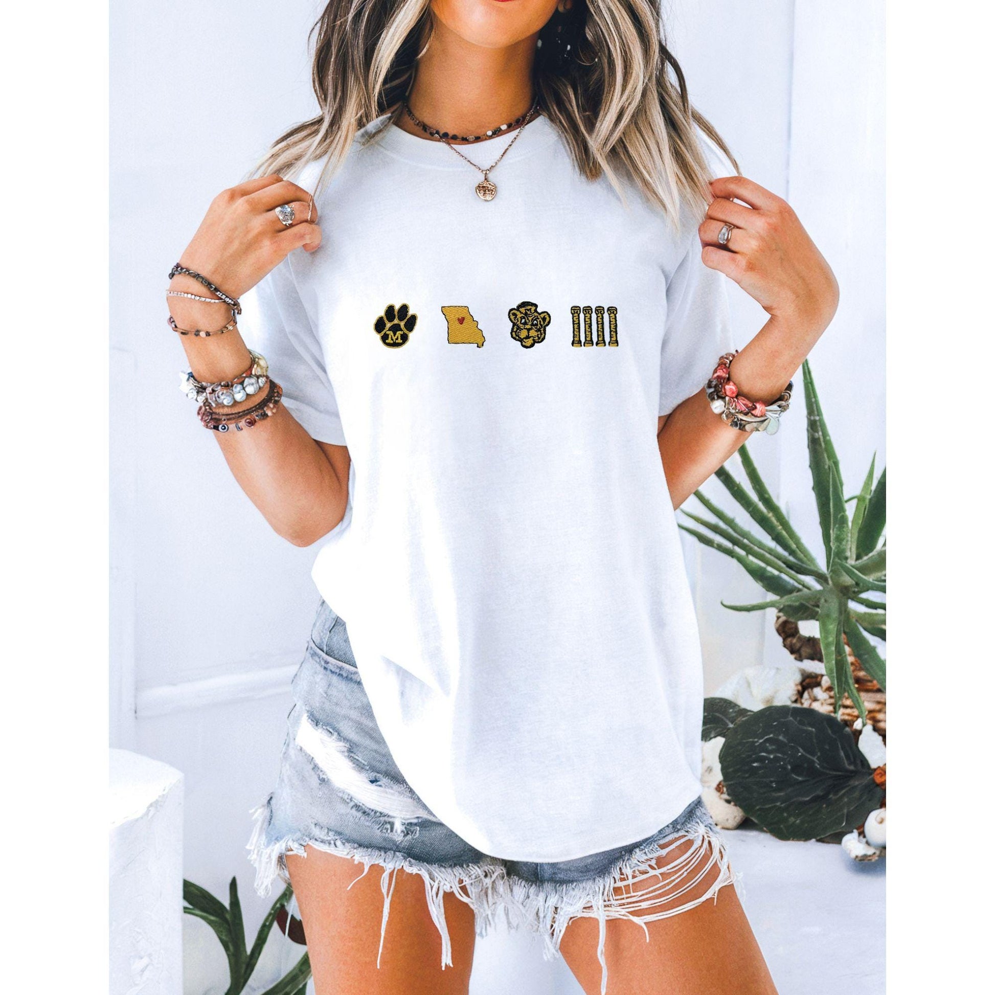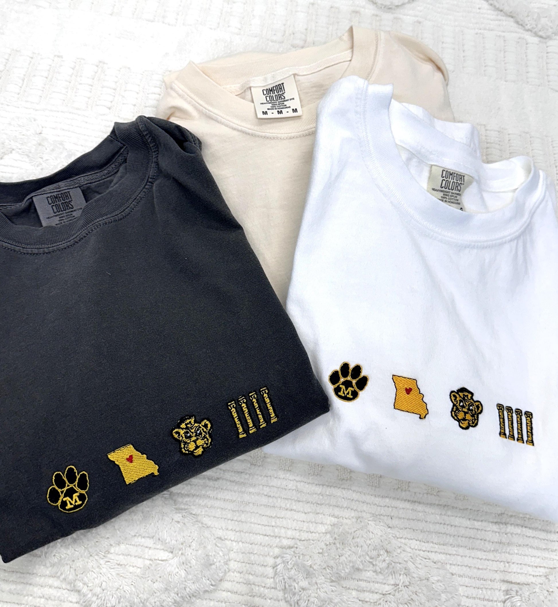 MIZ-ZOUrah!! Show your Tiger Pride with this adorable Comfort Color tee featuring Mizzou's famous icons-featuring the Paw, Missouri, Tiger Mascot and the columns. This design is not a print, but embroidered.
