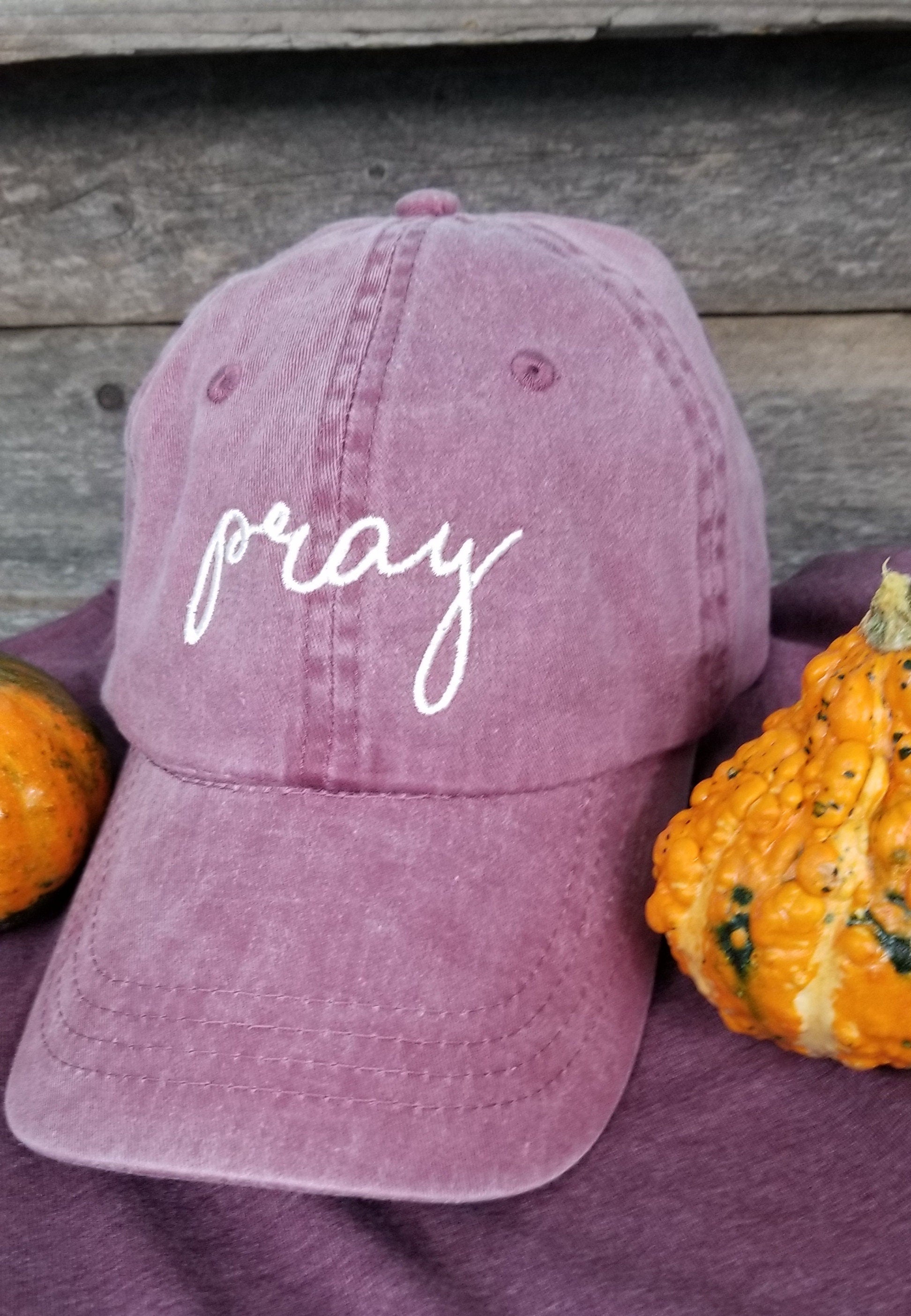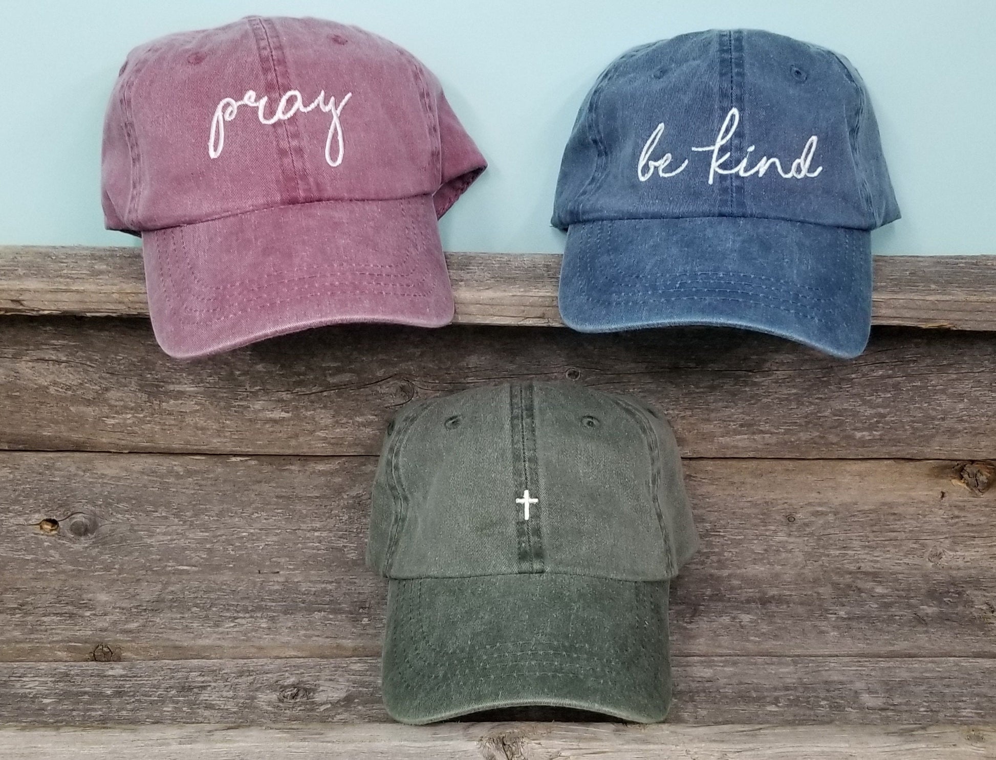 Show your faith with several of our other Christian designed hats. Other listings include Pray, Be Kind, tiny cross and not today satan. All are done in ivory thread on your choice of dad hat-maroon, hunter or navy.