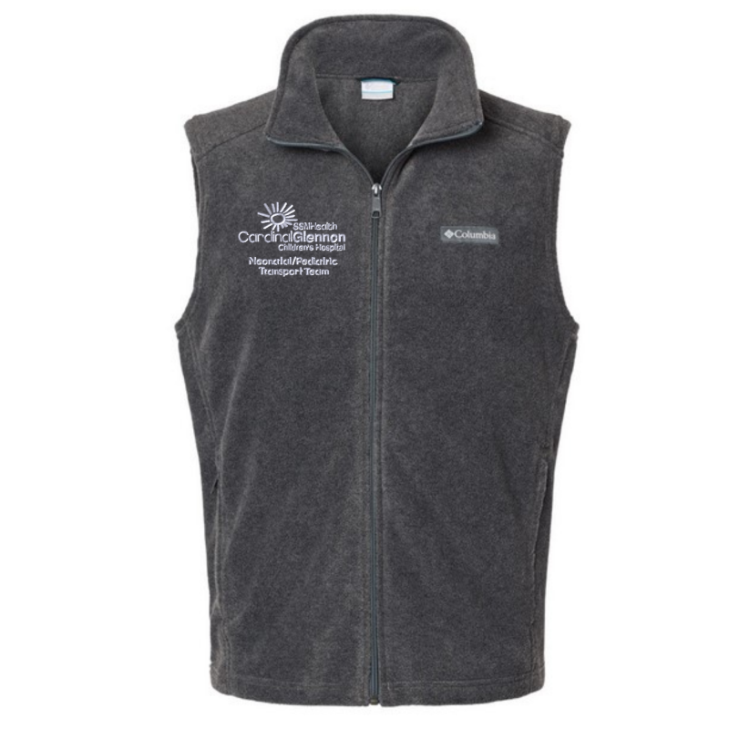 Columbia Fleece Vest with embroidered Cardinal Glennon Transport Team Logo