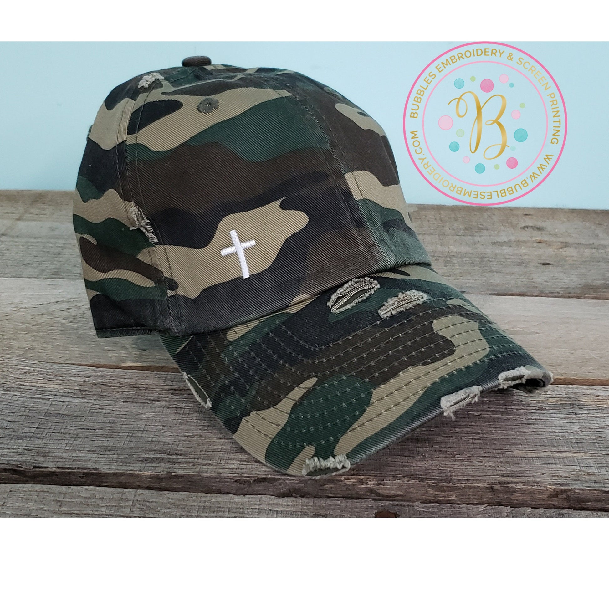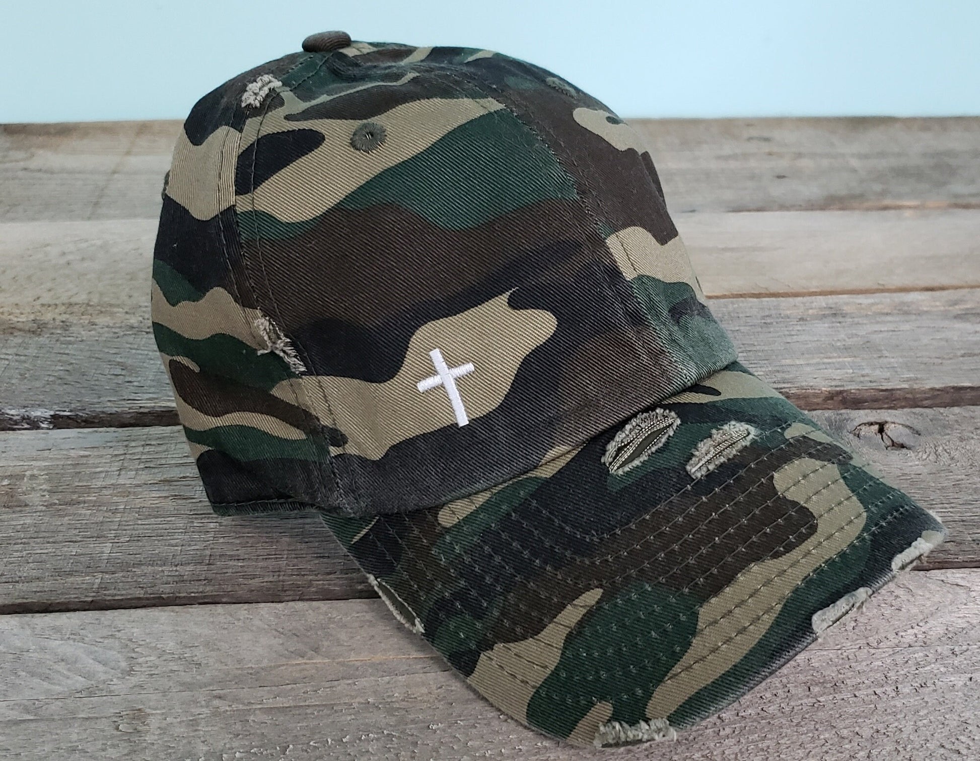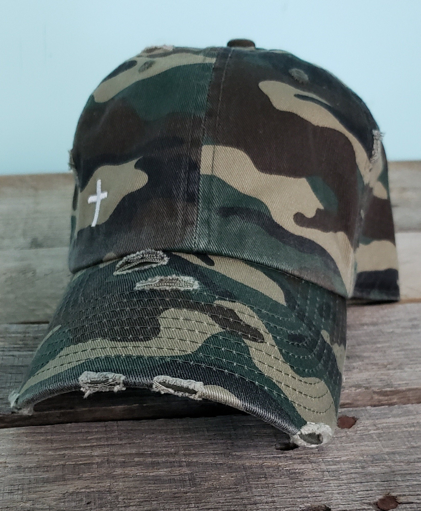 Camo Distressed Baseball Hat with tiny cross embroidered.