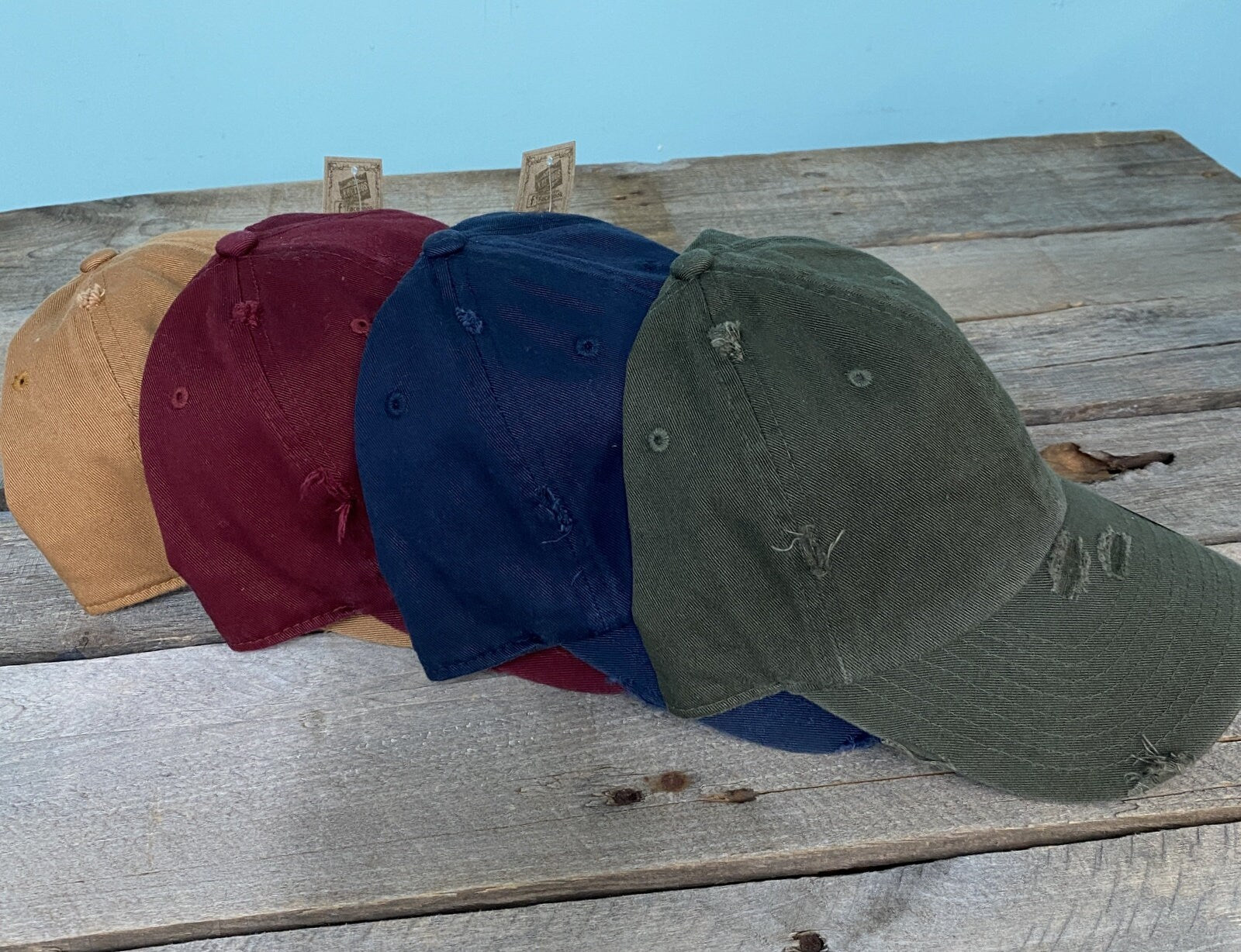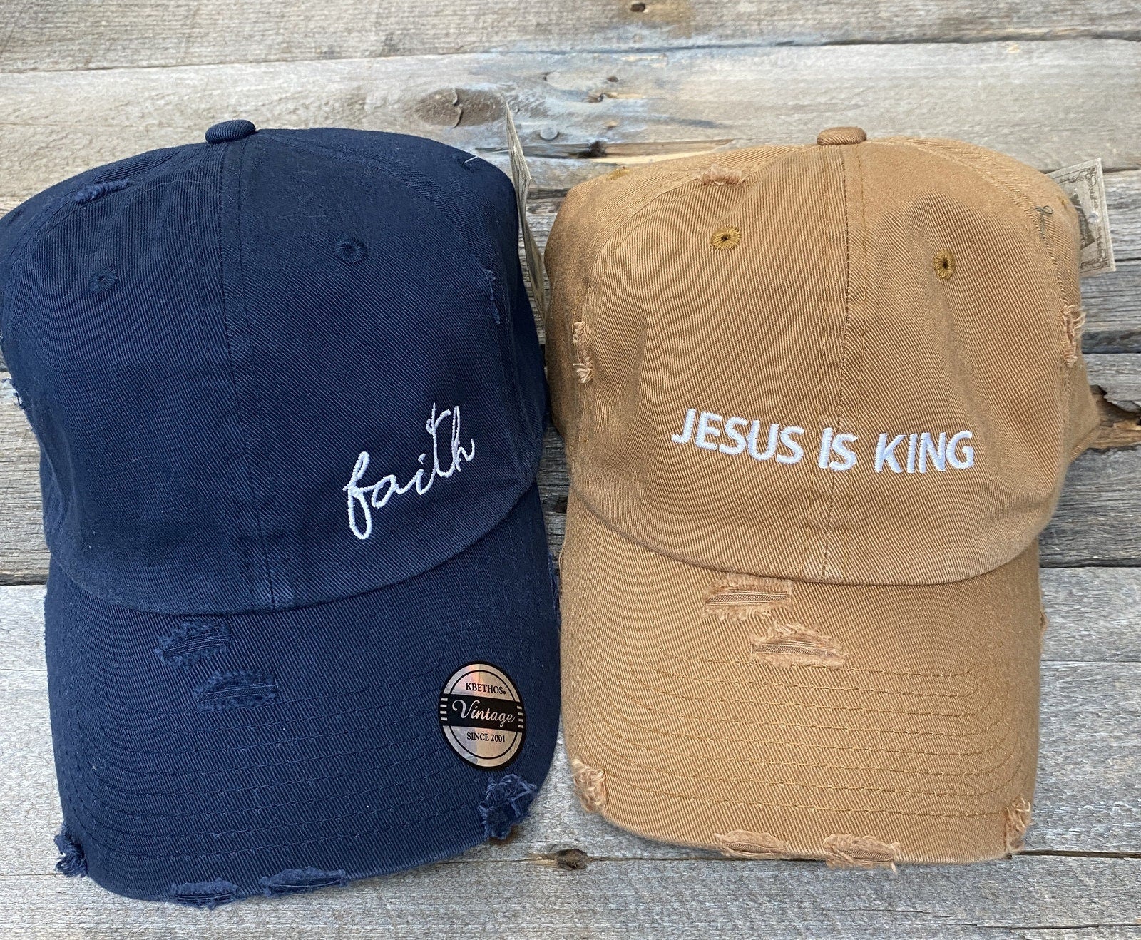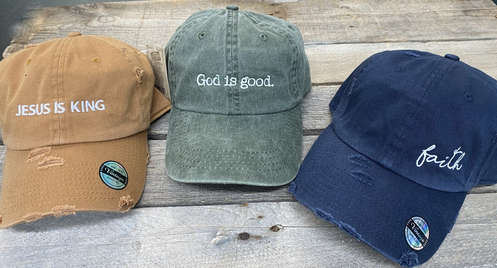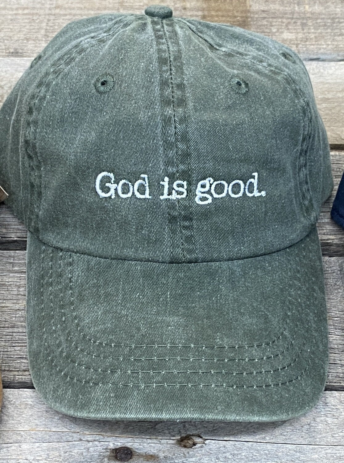 God is good embroidered baseball cap. Show your faith with this adorable unstructured distressed baseball cap with embroidery.