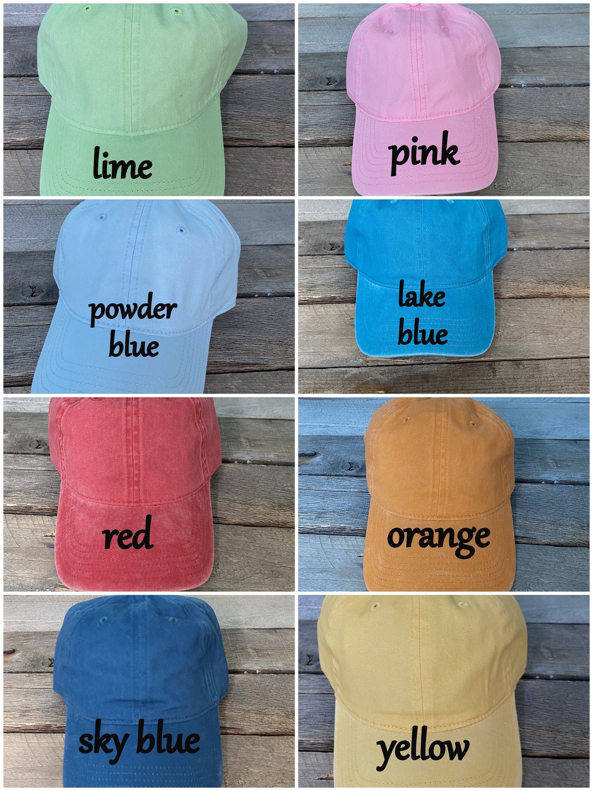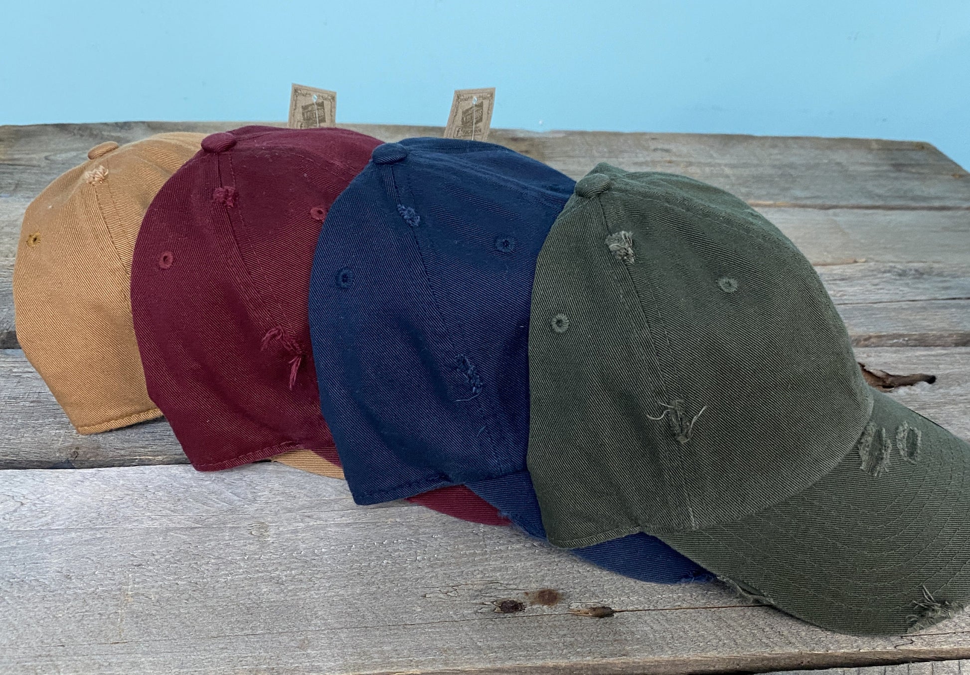 Available in pigment dyed hat, trucker style or distressed style hat.