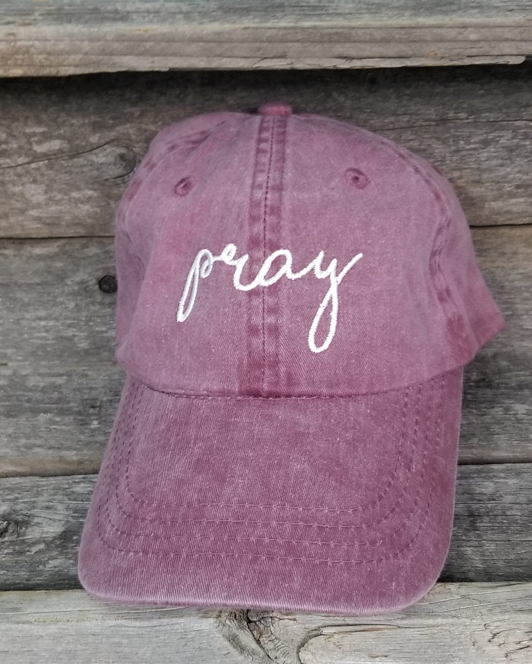 Pray pigment dyed dad hat, baseball hat, handwritten. Faith dad cap, maroon hat with ivory thread. Christian embroidered unstructured hat
