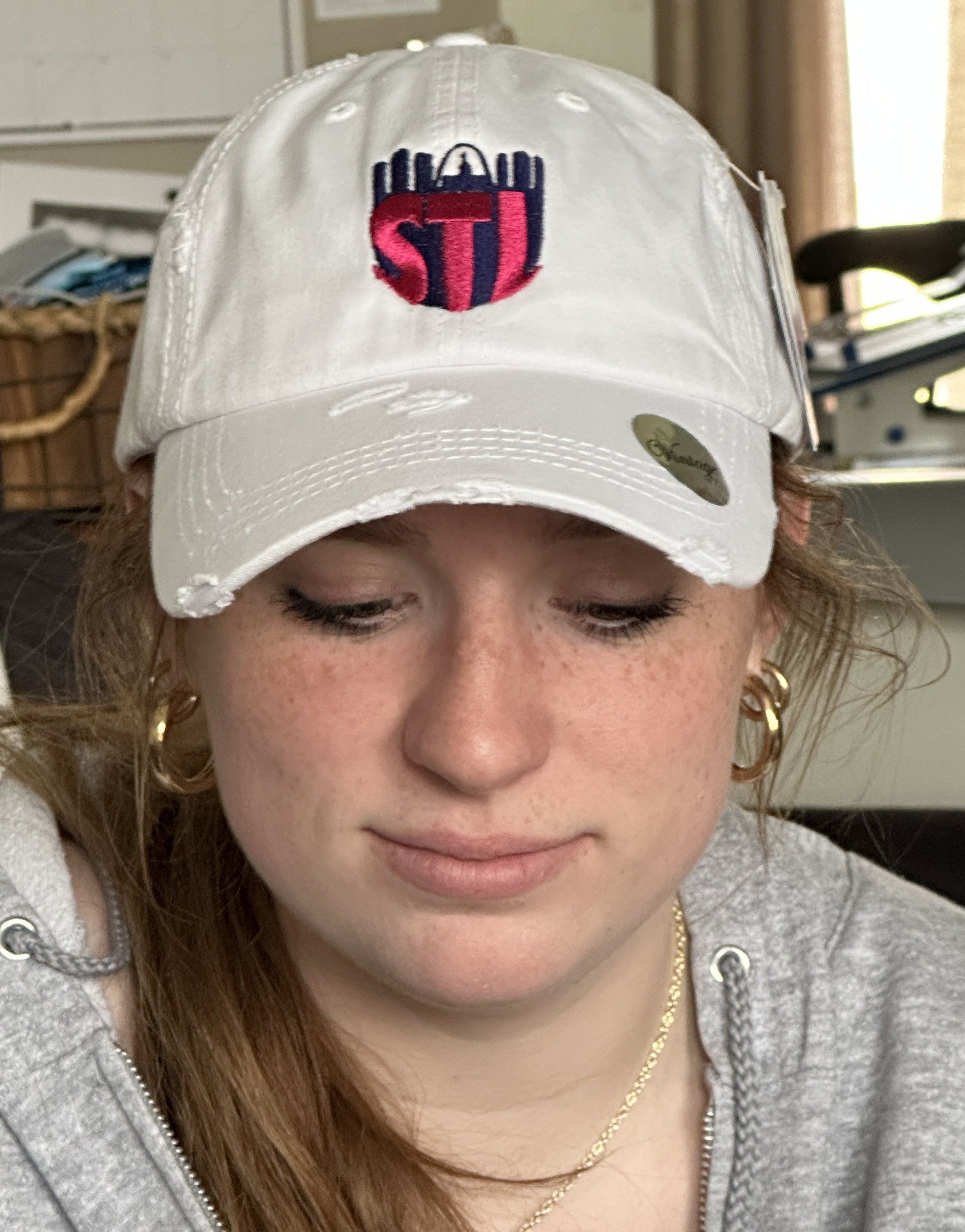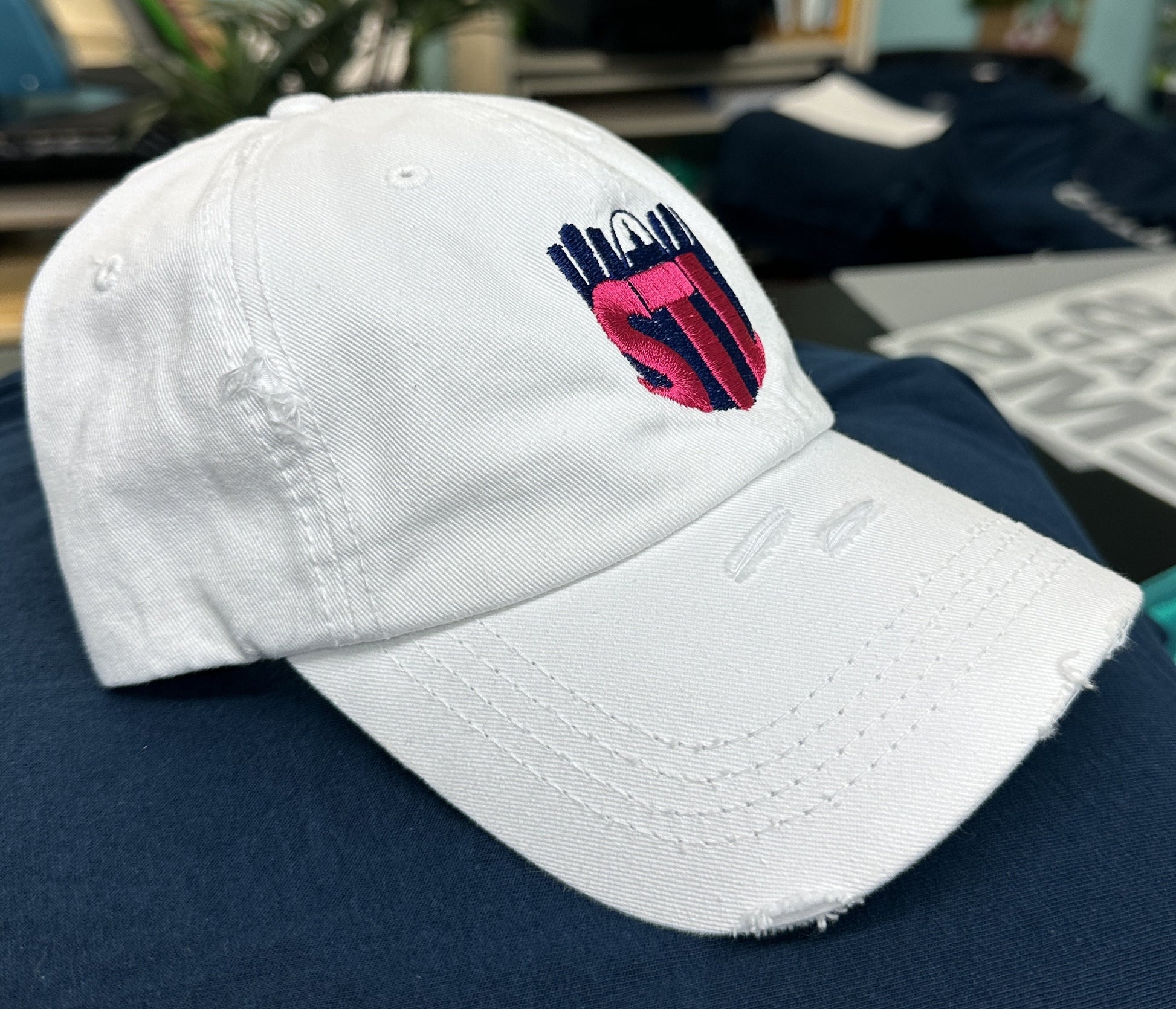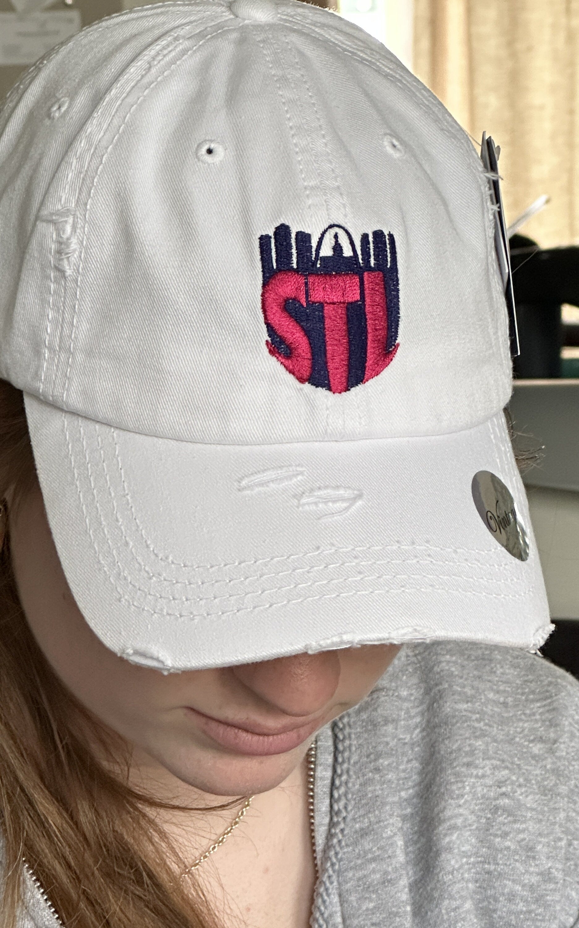 St.Louis City SC soccer baseball hat. White unstructured, distressed hat with embroidered design.