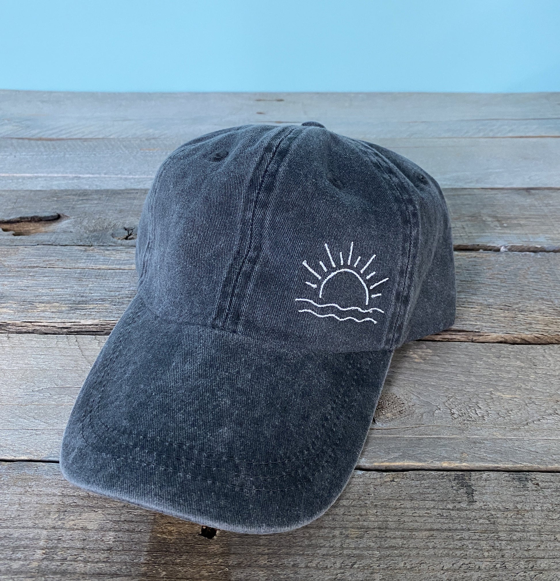 Be ready for the beach, lake or just a sunny day with this embroidered Sunshine and waves baseball hat!