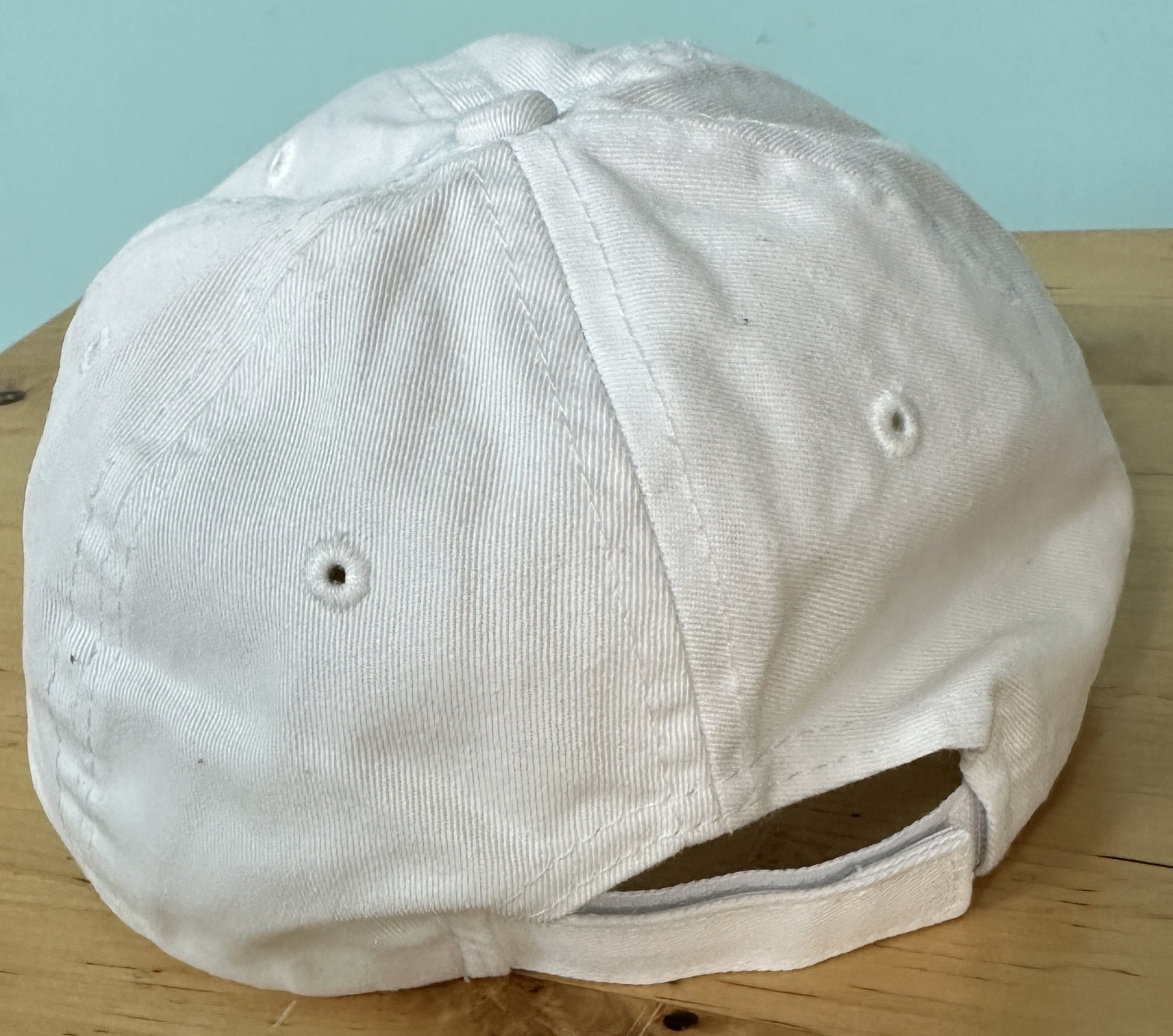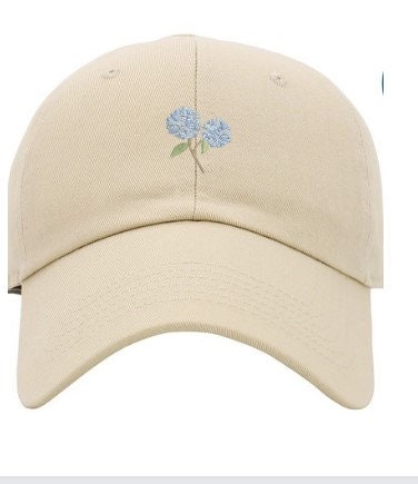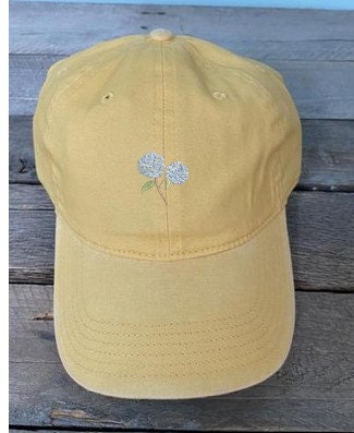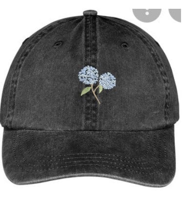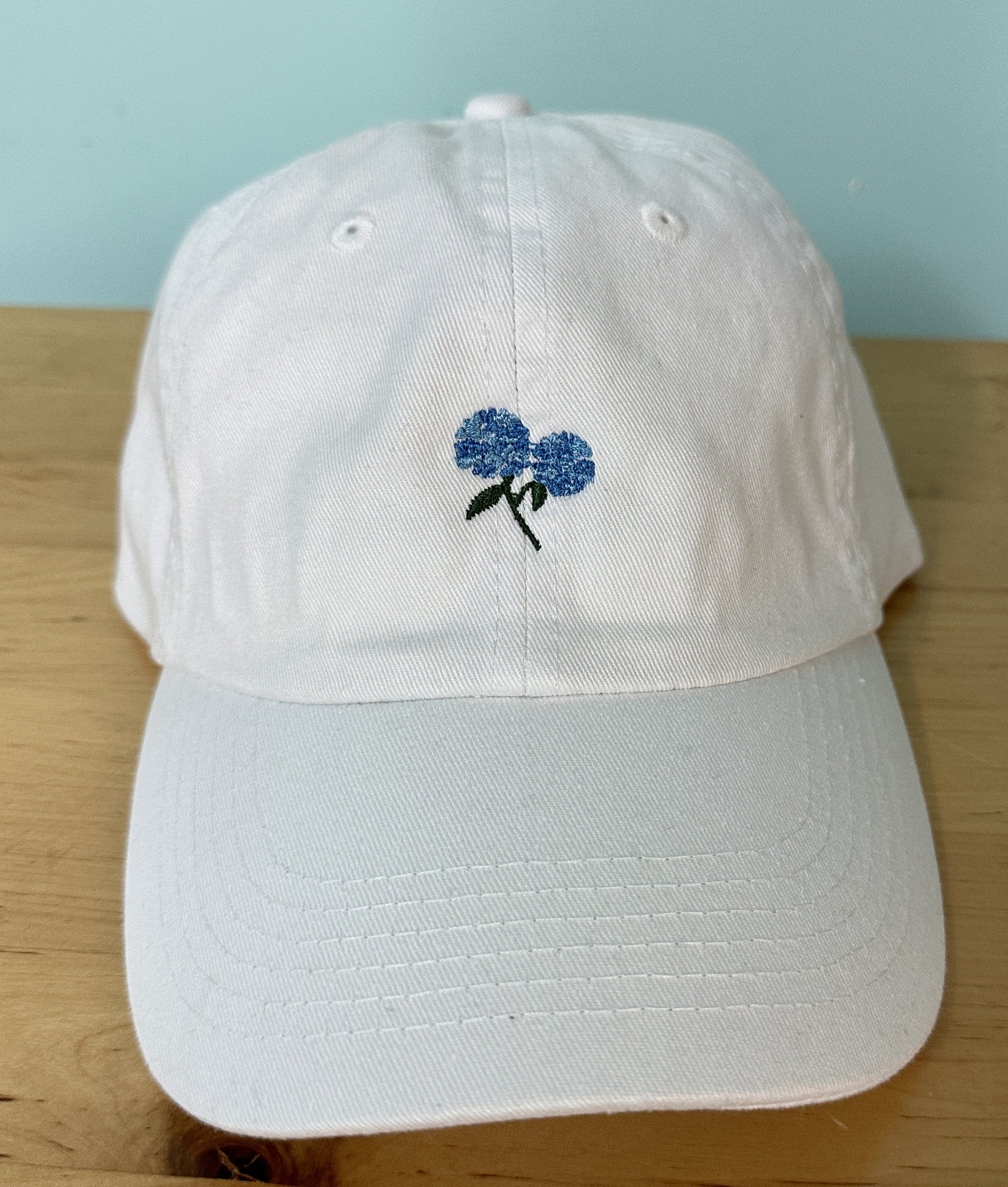 White Pigment Dyed baseball Hat with embroidered Hydrangea design